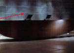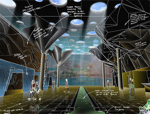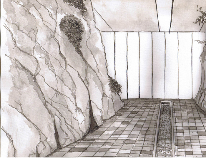 My initial sketch, showing the Spa internal foyer, with stylized cliff faces manufactured from steel plates and green shallow tiled central water feature. |