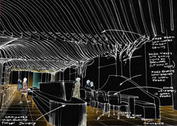 My initial sketch of the Spa's major dining room, with laminated floating timber beam ceiling and central food buffet |