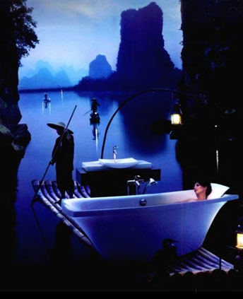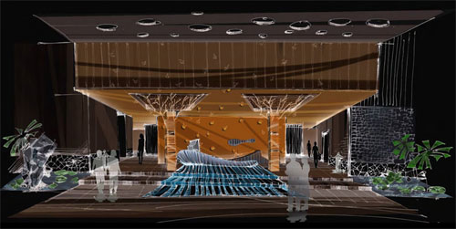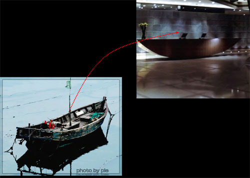 The Bath Boat illustration at the beginning set in the exact terrain drew on the Chinese local tradition, which was then explored with the large monolithic polished granite boat shaped reception desk.