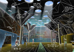 My initial sketch, showing the Spa internal foyer, with stylized cliff faces manufactured from steel plates and green shallow tiled central water feature. |