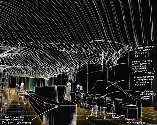 My initial sketch of the Spa's major dining room, with laminated floating timber beam ceiling and central food buffet |