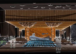 The Bath Boat illustration at the beginning set in the exact terrain drew on the Chinese local tradition, which was then explored with the large monolithic polished granite boat shaped reception desk.